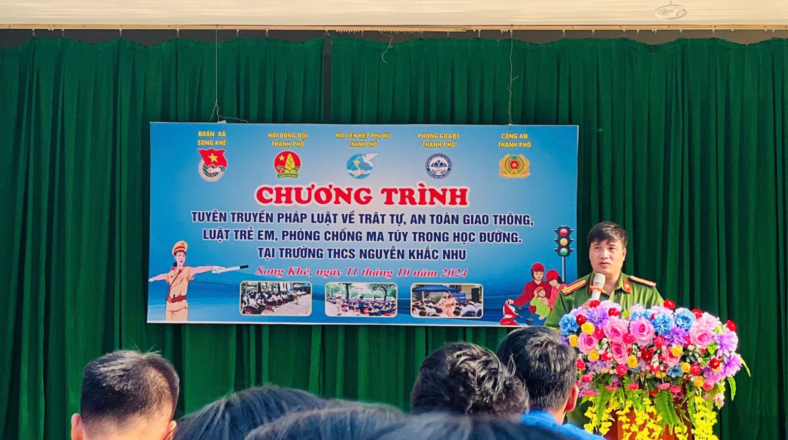 Thực hiện kế hoạch số 02-KHPH/LN ngày 09/8/2024 của Thành đoàn, Hội Liên hiệp Phụ nữ, Phòng GD&ĐT, Công an thành phố Bắc Giang về việc phối hợp tổ chức Chương trình “Tuyên truyền pháp luật về trật tự ATGT các trường học trên địa bàn thành phố Bắc Giang” năm học 2024 - 2025. Ngày 11/10/2024, Liên đội trường THCS Nguyễn Khắc Nhu đã tổ chức Chương trình “Tuyên truyền pháp luật về trật tự, an toàn giao thông, luật trẻ em, phòng chống ma tuý trong học đường” nhằm nâng cao nhận thức cho giáo viên, học sinh và phụ huynh về tầm quan trọng của việc tuân thủ luật giao thông, luật trẻ em, phòng chống ma tuý trong học đường.