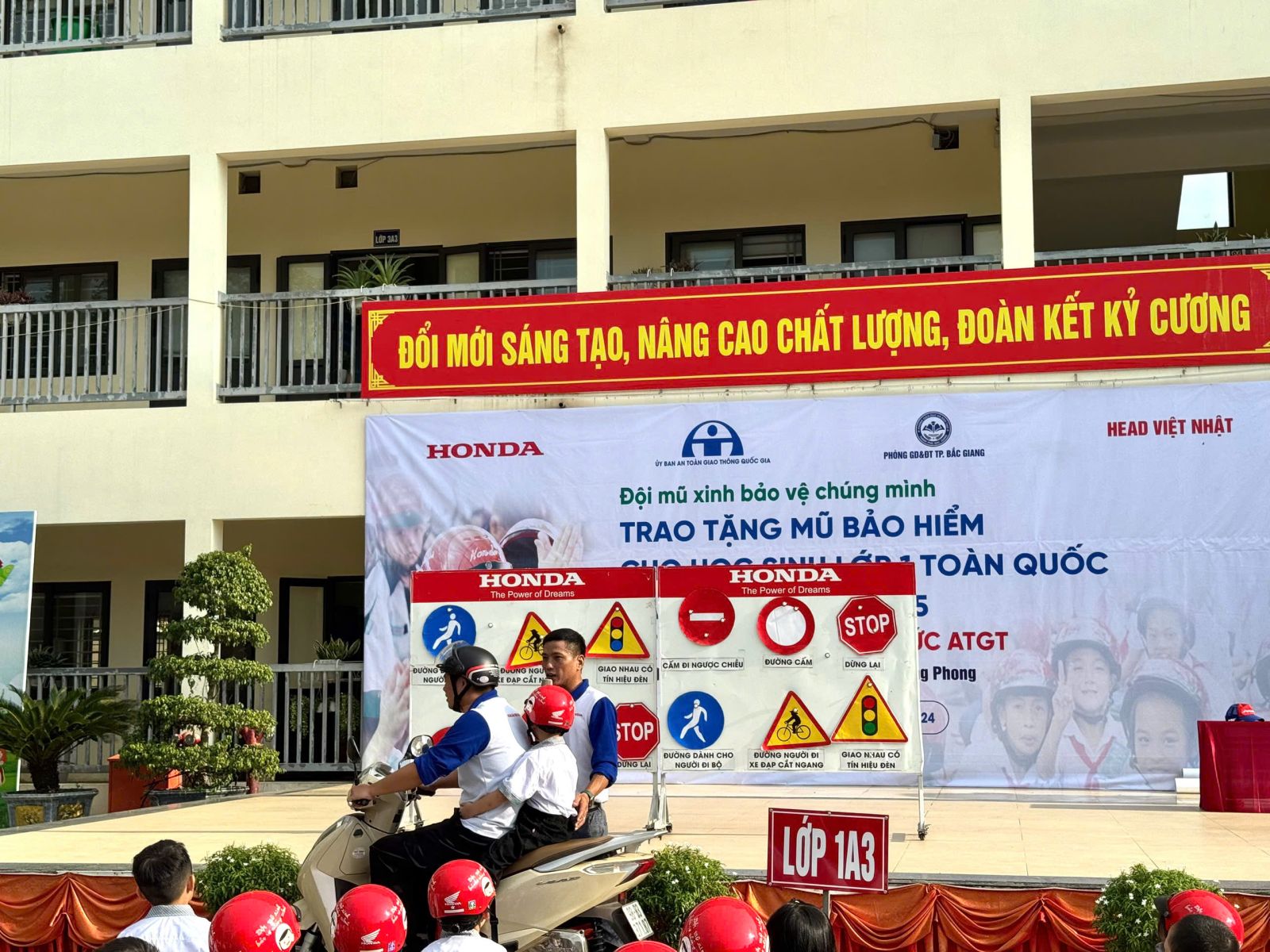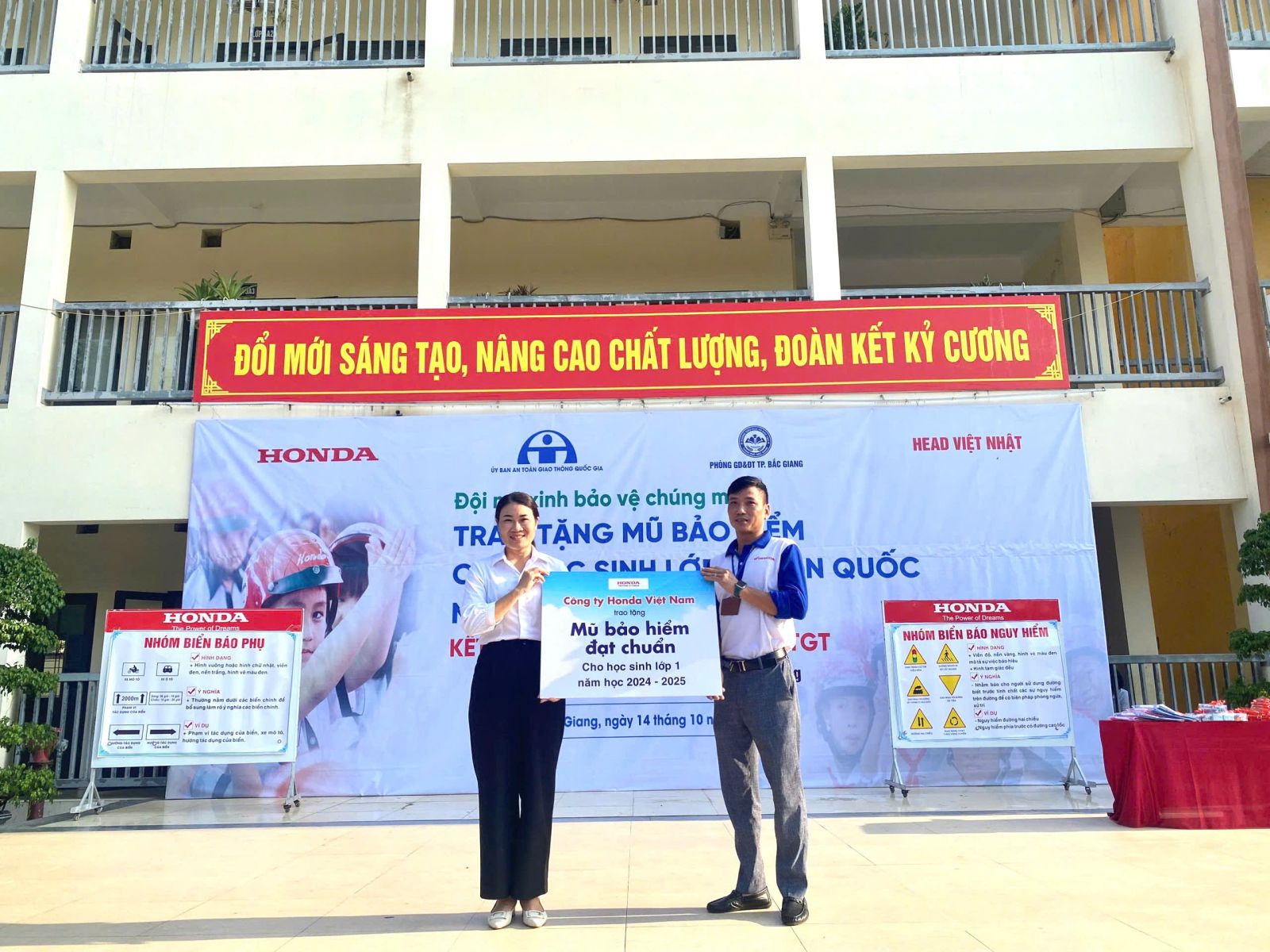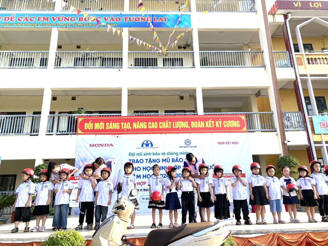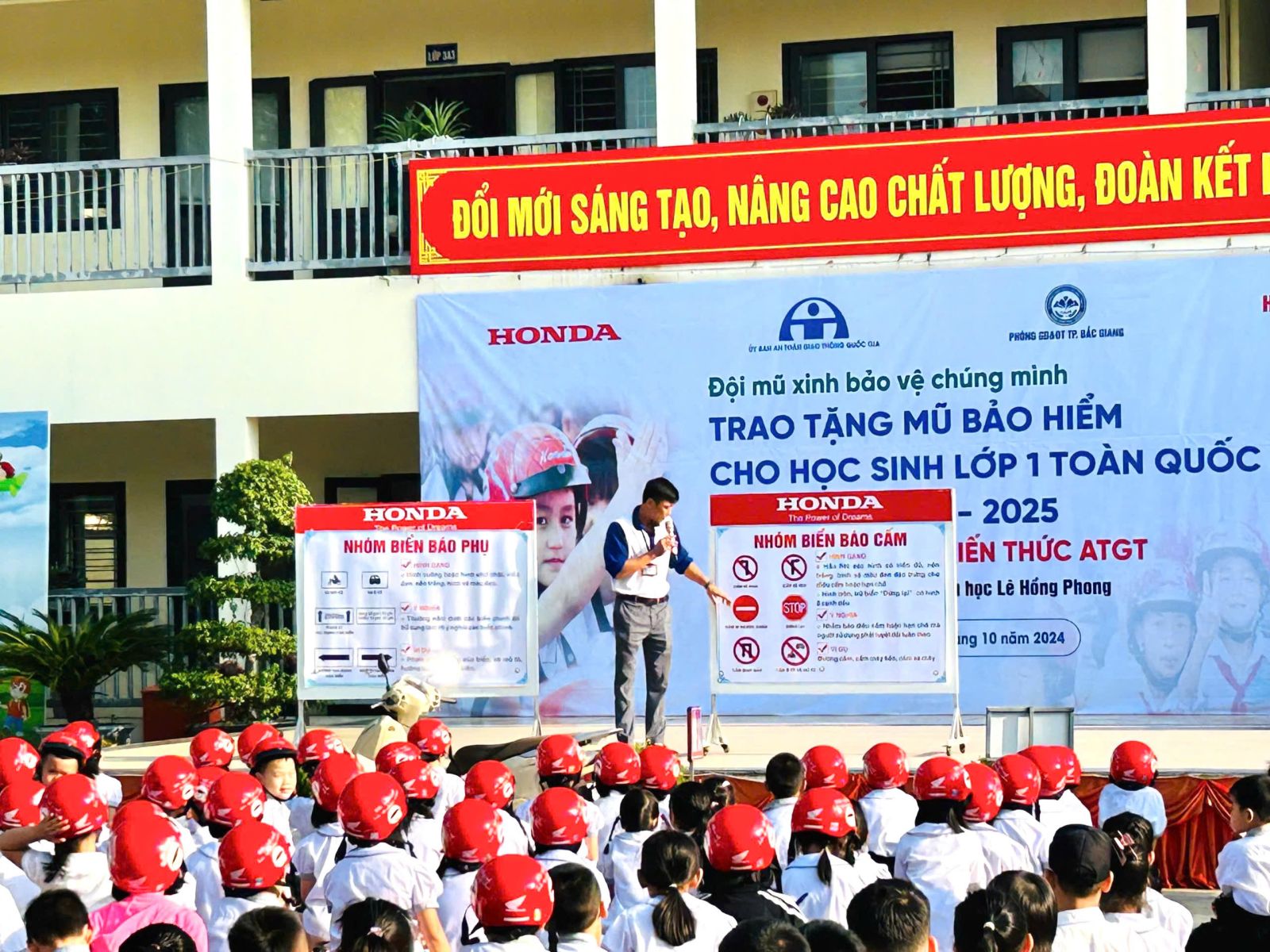 Được biết, Công ty Honda Việt Nam phối hợp với Ủy ban An toàn Giao thông Quốc gia và Bộ Giáo dục & Đào tạo trao tặng 2 triệu mũ bảo hiểm đạt chuẩn cho học sinh lớp 1 trên toàn quốc trong năm học 2024-2025 và kết hợp tổ chức đào tạo an toàn giao thông cho GV, phụ huynh và các em học sinh. Với các trường học trên địa bàn thành phố Bắc Giang việc trao tặng Mũ bảo hiểm cho học sinh lớp 1, tổ chức cho cha mẹ học sinh ký nhận mũ bảo hiểm và thực hiện cam kết chấp hành quy định đội mũ bảo hiểm cho con em khi tham gia giao thông theo quy định thực hiện xong trước ngày 25/11/2024.