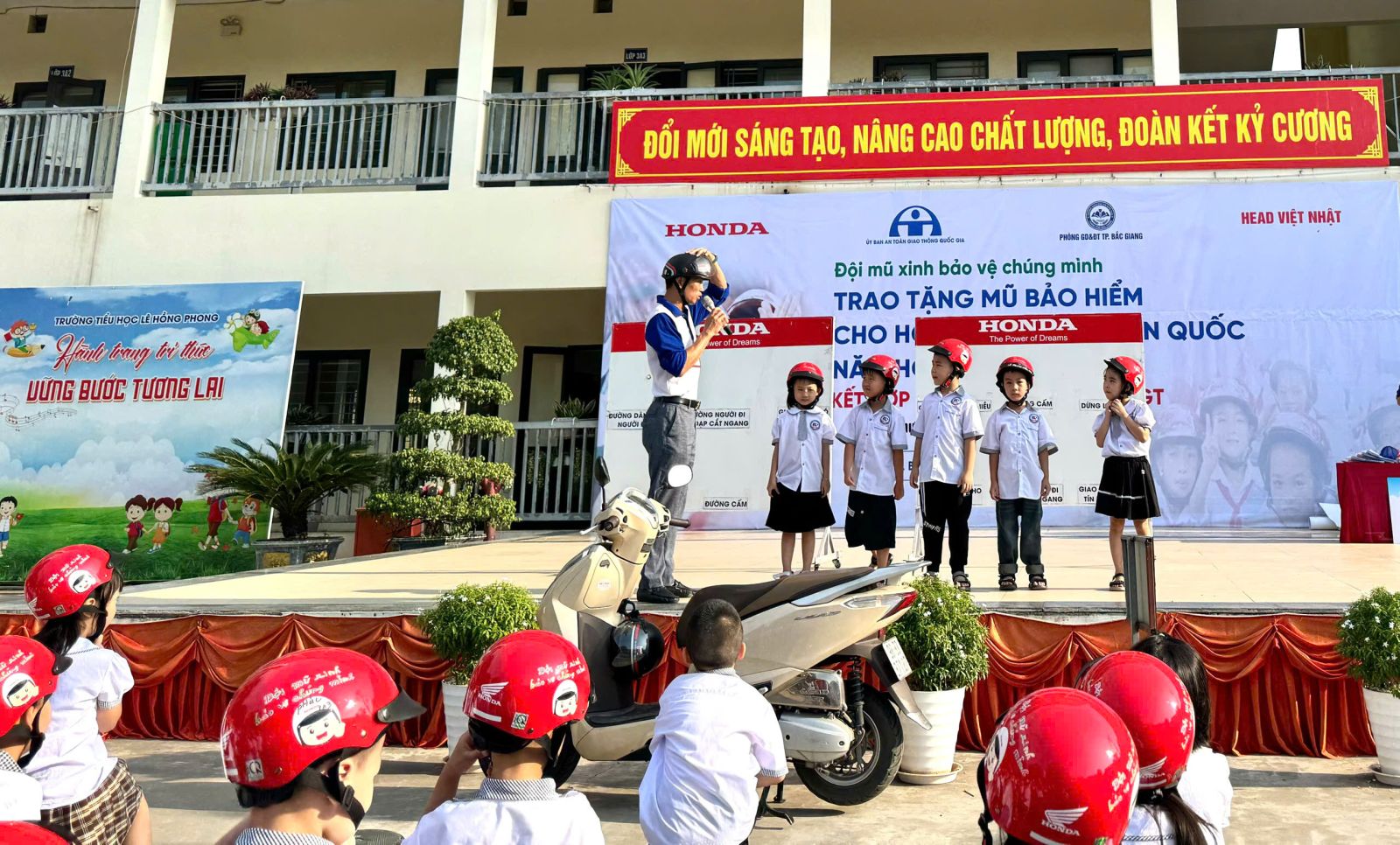 Sáng nay, ngày 14/10/2024, Phòng Giáo dục và đào tạo thành phố Bắc Giang phối hợp với Heat Việt Nhật tổ chức Chương trình trao tặng mũ bảo hiểm cho học sinh lớp 1 năm học 2024-2025 với chủ đề “Đội mũ xinh bảo vệ chúng mình”; kết hợp đào tạo kiến thức ATGT cho cán bộ giáo viên, phụ huynh và các em học sinh Trường Tiểu học Lê Hồng Phong. Chương trình nhằm nâng cao ý thức về việc chấp hành quy định bắt buộc đội mũ bảo hiểm đạt Quy chuẩn kỹ thuật Quốc gia cho trẻ em khi ngồi trên mô tô, xe gắn máy, xe đạp điện, qua đó giảm thiểu hậu quả do tai nạn giao thông gây ra đối với trẻ em. Góp phần thực hiện mục tiêu nâng tỷ lệ đội mũ bảo hiểm đạt Quy chuẩn kỹ thuật Quốc gia đối với trẻ em là 100% vào năm 2030. Tuyên truyền, phổ biến kiến thức an toàn giao thông (ATGT) cho học sinh và phụ huynh, nâng cao nhận thức về ATGT thông qua hoạt động truyền thông.