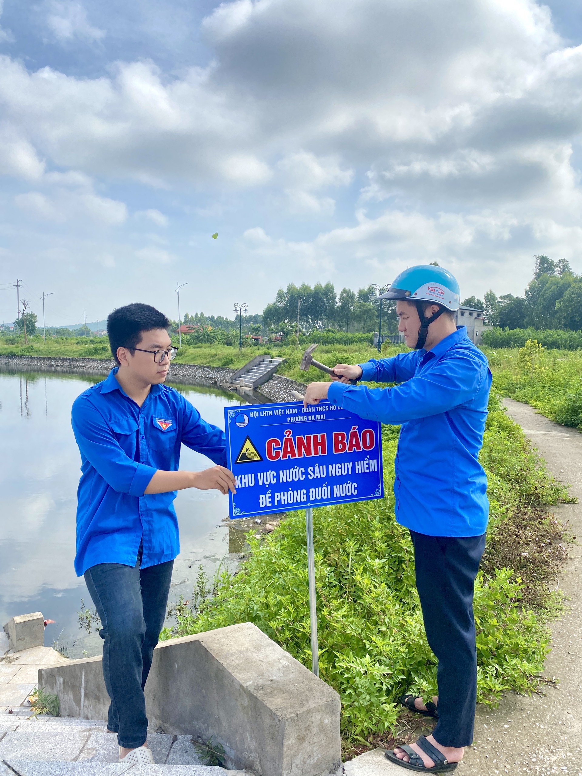 Đoàn phường Đa Mai thực hiện công trình thanh niên gắn biển cảnh báo khu vực nước sâu, nguy hiểm, đề phòng đuối nước