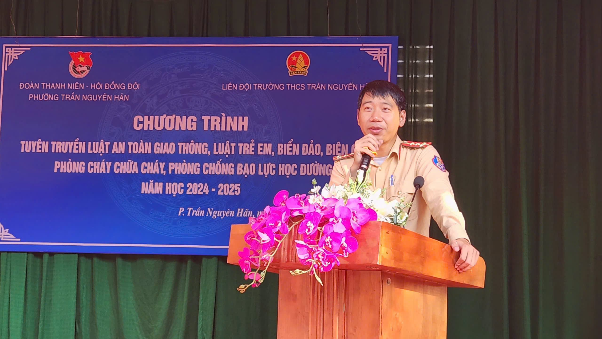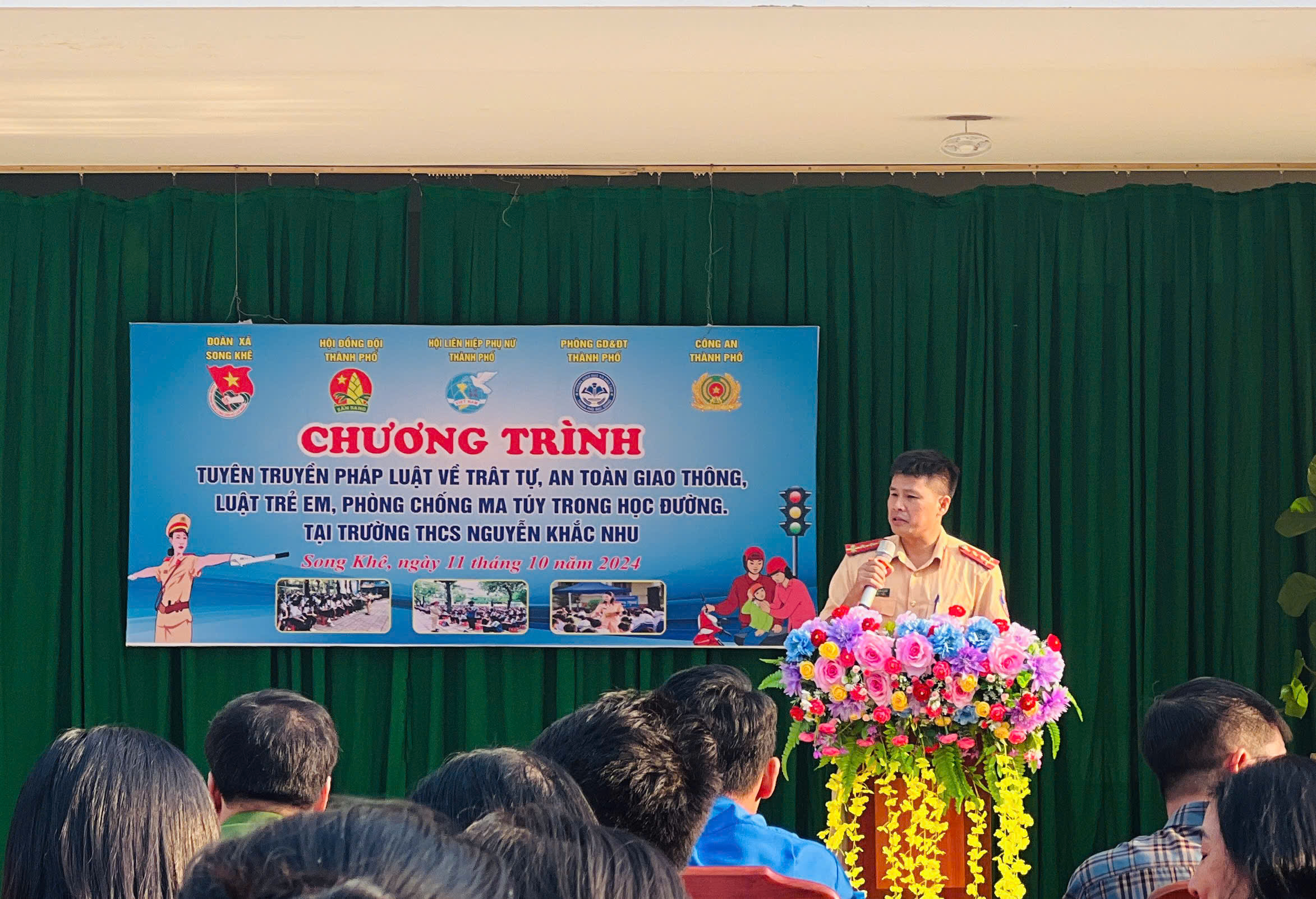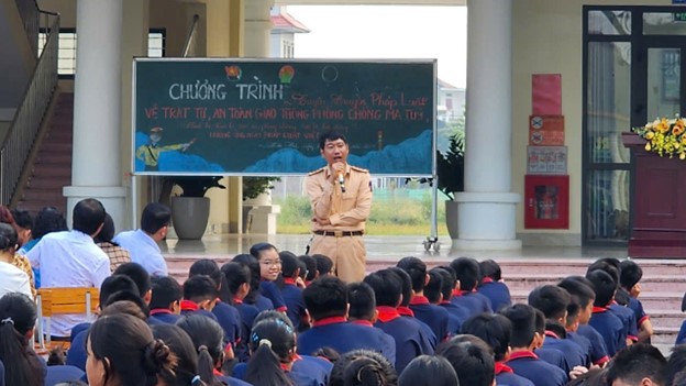 Liên đội Trường THCS Nguyễn Khắc Nhu: Tổ chức chương trình tuyên truyền pháp luật về trật tự, an toàn giao thông, luật trẻ em, phòng chống ma tuý trong học đường.