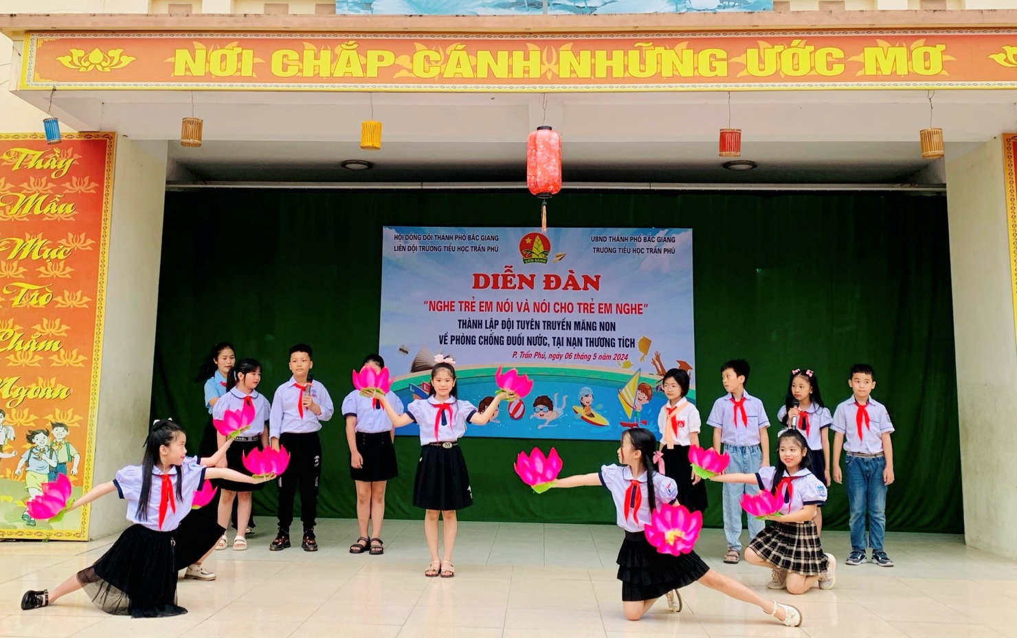 Liên đội Trường Tiểu học Trần Phú tổ chức Diễn đàn trẻ em “Nghe trẻ em nói và nói cho trẻ em nghe”; thành lập và ra mắt đội tuyên truyền măng non về phòng chống đuối nước, tai nạn thương tích năm học 2023-2024.