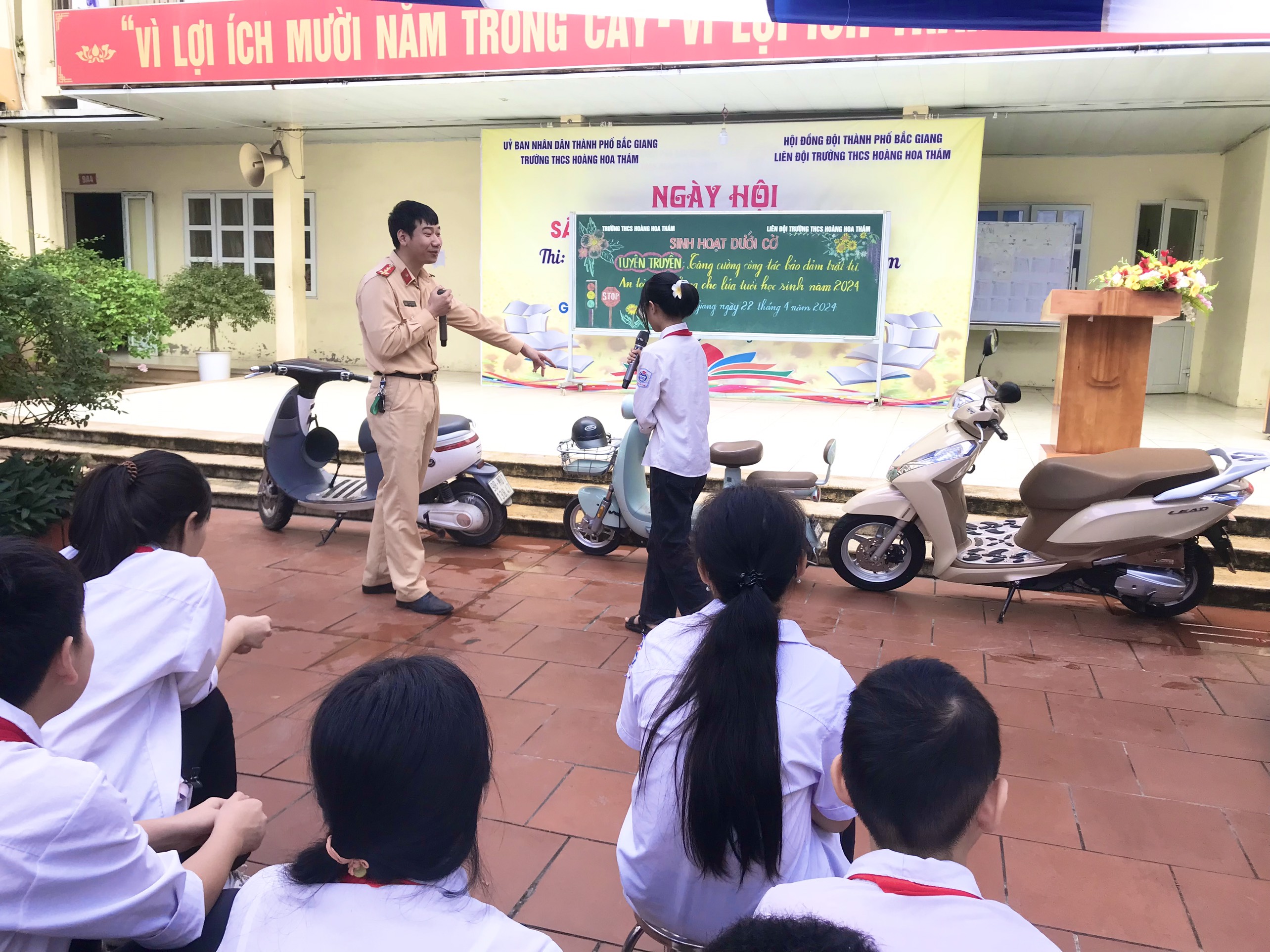 Liên đội trường Tiểu học Minh Khai - TP Bắc Giang phố hợp với Đội cảnh sát giao thông TP Bắc Giang tổ chức tuyên truyền pháp luật về trật tự và an toàn giao thông cho cán bộ, giáo viên và học sinh.
