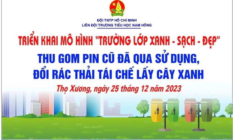 Liên đội Trường Tiểu học Nam Hồng Thành phố Bắc Giang triển khai mô hình " Trường lớp xanh" Thu gom pin cũ đã qua sử dụng đổi rác thải tái chế lấy cây xanh năm học 2023-2024.