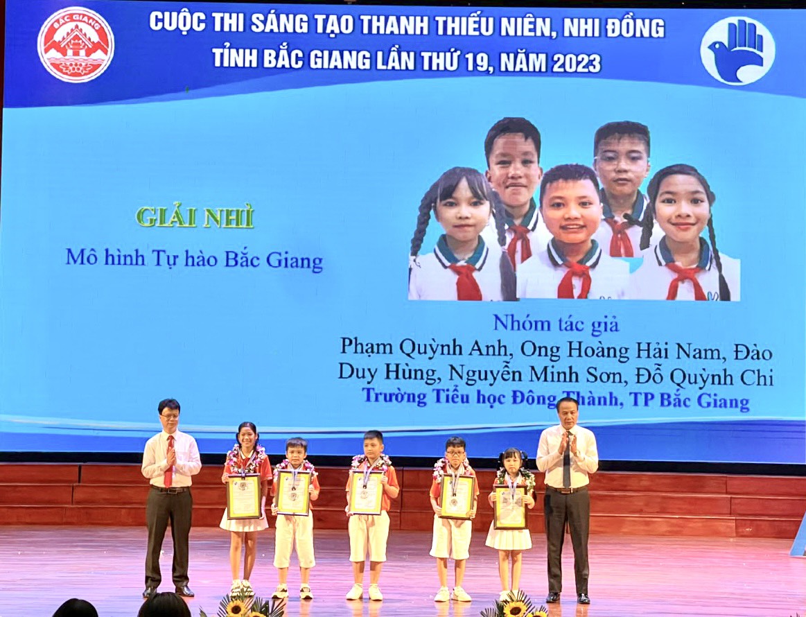 Nhóm tác giả dự thi Cuộc thi Sáng tạo thanh thiếu niên, nhi đồng tỉnh Bắc Giang lần thứ 19, năm 2023 của Trường Tiểu học Đông thành, hân hoan nhận giải thưởng